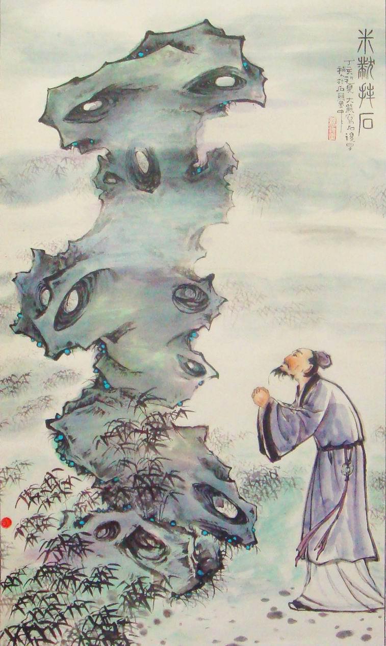 米芾是宋代著名的书画家,他的书画造诣非常高,宋徽宗时官居书画学博士。然而他爱石成癖,世传的“米芾拜石”甚至淹没了米芾的其它成就。我们知道,过去和现在,有很多可以称得上“石痴”的人,但是,至少在痴石的疯狂癫迷程度上,还没有人能超越他。因此“米芾拜石”又被世人称为“米癫拜石”。