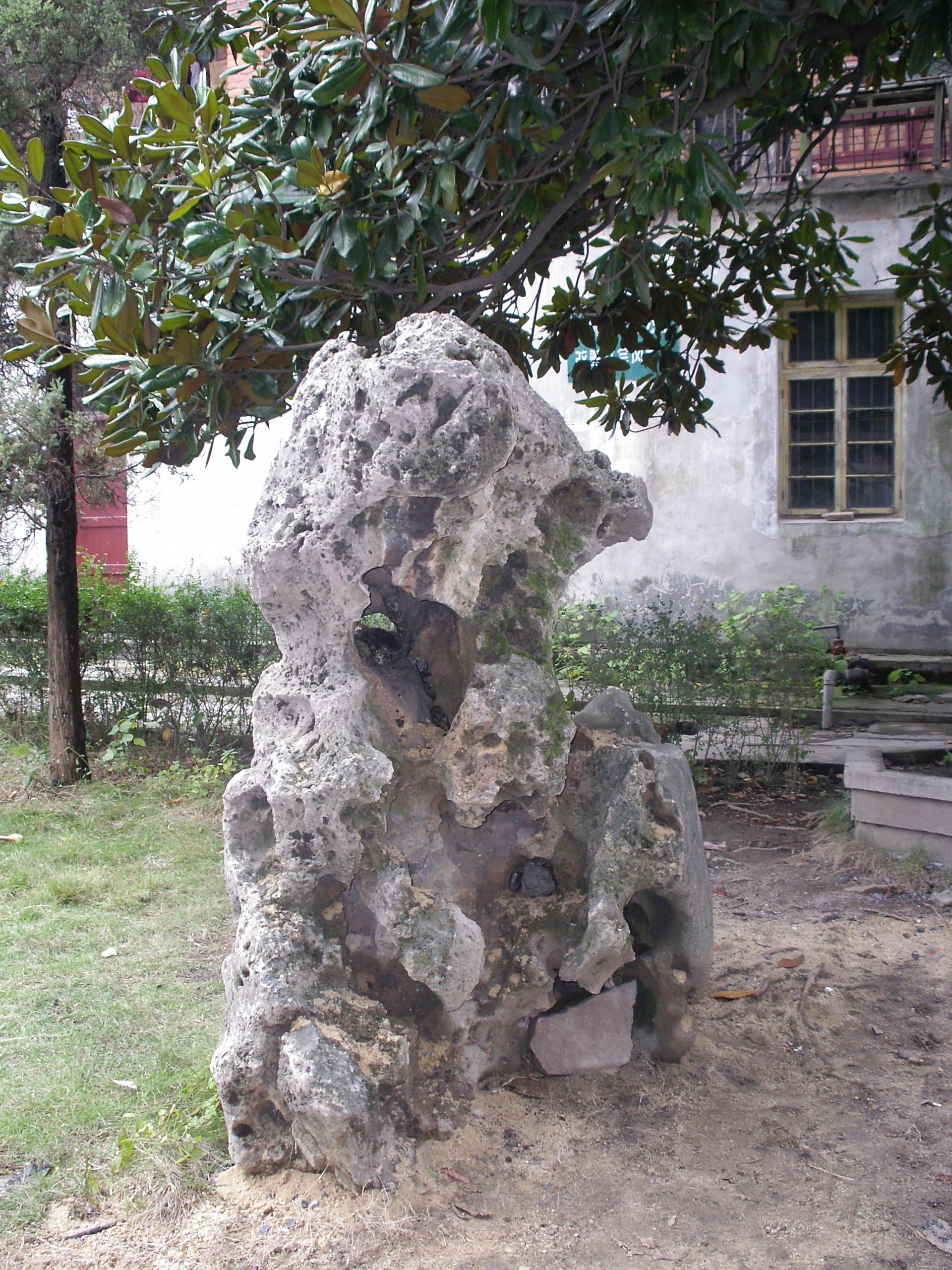 我们走进门楼,正午时分,没见游人。正疑惑间,见一图书馆的工作人员走了出来,他告诉我们,“石丈”就在图书馆的庭院内,穿过庭院便是米公祠,顺着他手指的方向,我们见到了那座令米芾癫痴的神石——“石丈”。