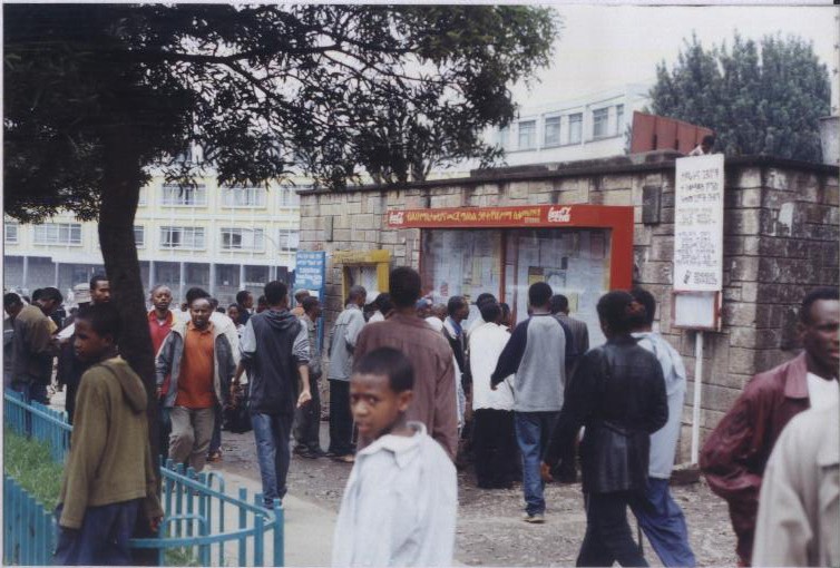 一群年青人正在招工牌前寻找未来的梦。据说埃塞俄比亚的失业率相当高,马路两旁到处是无事闲荡着的游民。每到一处,我刚下车,掏出相机,便会有人前来围观,是对我们这几个外国人感到新鲜?还是……?“出门在外,安全第一”,我只得匆匆拍完照,又迅速钻进了汽车。