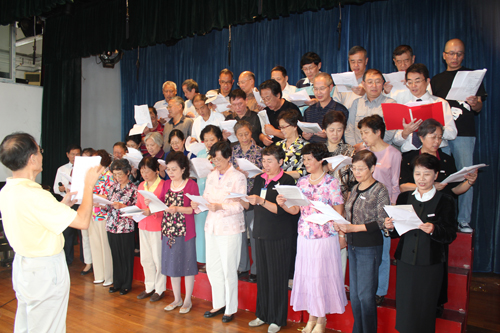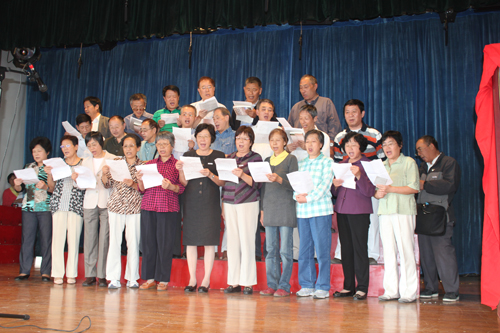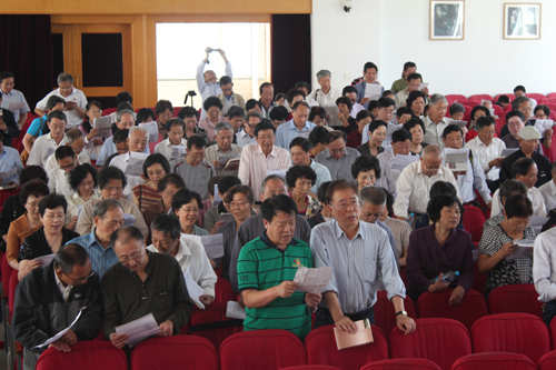 下面,全体起立,全场齐唱65届中三年级校友《纪念入校50周年庆典活动》会歌:《我们的校园》。
