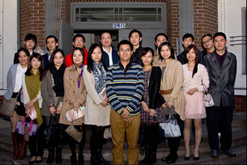 在母校教学楼拐角处的合影(前排左一为本文作者)