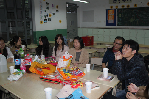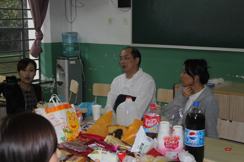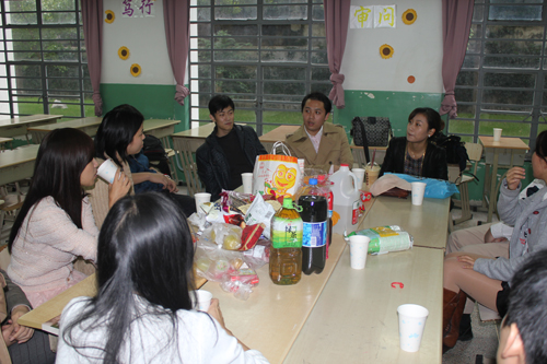 将近3点,同学们陆续来到了教室里,原本冷清的教室热络了起来。又见到那一张张熟悉的脸庞,话匣子一开可就收不住了。正聊的起劲,门口出现了一个身影。若是十年以前,大家定作一片鸦雀无声状,但十年之后的今天,一声“於老师”,将我们的目光引到了一起。没错,他就是我们当年的班主任,於国金老师。於老师被我们热情地迎入教室,大家拼起了课桌,围坐一圈,在这样的氛围中继续着当年的话题。