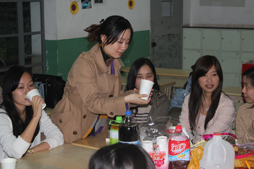 从事金融工作的蒋蓓华(站立者)似乎在掂量纸杯的含金量