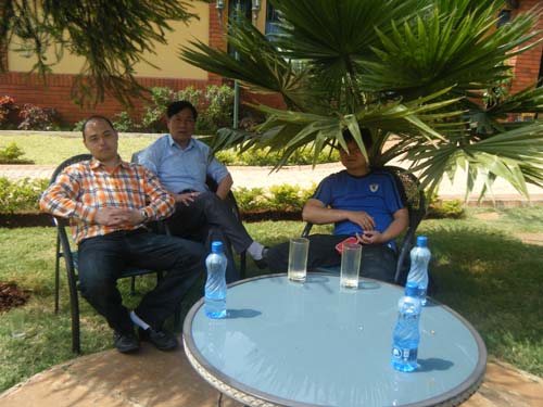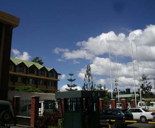 我们下榻在内罗毕市郊的一座红十字会管辖的宾馆里,宾馆不大,但有不少世界各地游客。庭院里的小桥流水,颇有我国江南水乡风味,池内数条金鱼悠游正欢,岸边芍药花儿开得正艳。蓝天上飘着朵朵白云,阳光绚丽。二道武装门卫把守着,使人有一种清静安全的感觉。