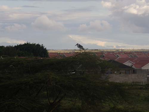 清晨,从窗口向外眺望,这就是内罗毕,一个花园式的城市。瞬间,一只大鸟飞来停留在树梢上,我立刻兴奋起来。肯尼亚是个多鸟的国家,在去工厂的公路旁,可以见到树林中栖息着许多白鹭和叫不出名字的鸟群,煞是漂亮。据说,每年春天都会有许多摄影爱好者,从世界各地汇聚到这里。