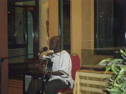 应该说,在这小小的庭院里,环境还是不错的,虽然饭后“信步闲庭”,足迹也只能百步之远,然后,那黑人歌手自弹自唱的佐餐演奏,时而亢进,时而深沉,却赋予了一种难以忘怀的情感。我们为他的歌,作了诠译: