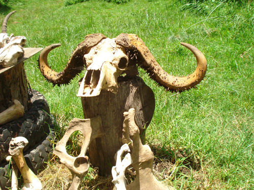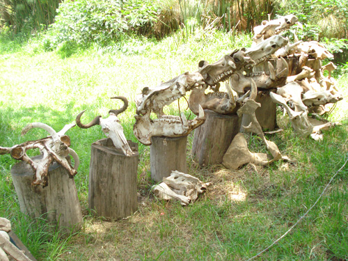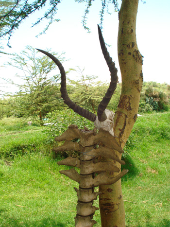 与马赛人合影后,我们继续向森林深处走去。在一片桦树林里发现一群珍贵的白尾猴,数了数有7只。再往前去,见到了几堆河马和羚羊的遗骸。当我的目光刚刚触及到这些骨骸时,我就知道,我已被它们征服了,这种无言的震撼力,像是在向人们倾诉着历史的沧桑。