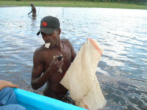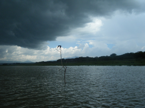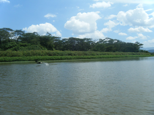 我们穿过树林,沿着一条掩饰在芦苇荡中的小路,来到了湖边。纳瑞斯告诉我们,这就是奈瓦沙湖。远远望去,碧空万顷,烟波浩荡。我们坐上游艇,荡舟在湖面,沿着湖岸徐徐驰去,听一声鸟鸣,闻一缕花香。游艇驰到一浅水湾,只见两个几乎全裸的黑小伙子,正在水中拉网、甩售活鱼,他们聪明地将钱塞在帽子里,高兴地帮船主挑鱼。