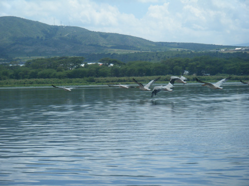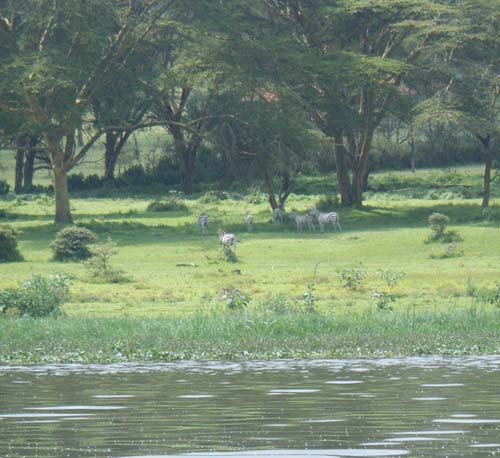 “你们看,那儿有一只秃鹫!”船主用手指着岸上最高那棵树的梢头说。“嘟——”一声哨响,随着船主手中的鱼儿抛出,那秃鹫恰似一道黑色的闪电,在鱼儿落水瞬间轻盈地将它叼走了。“真漂亮,这次开了眼界了!”随着手中相机的“咔嚓”声,我们不约而同地呼喊。正说着,只见一群大嘴巴的鹈鹕列成一行在水面掠过。远处岸边绿草坪上,依然可以看到几群斑马在自由地徜徉。