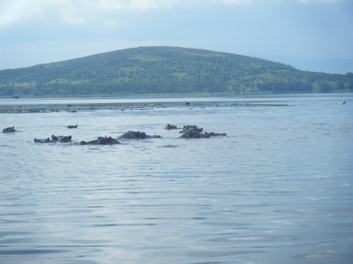 游艇继续向前,只见一群河马匍伏在水中,张着大嘴,似乎要吞噬什么。1只,2只,……7,8只,啊,15,16只……数不清了。我们想靠近河马,又怕被撞翻了船,近了,近了!我的神经都绷紧了。就在此时,船主轻轻一拔,游艇转了弯,向湖的深处驰去。
