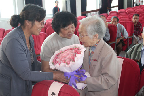 歌声中,沈献民、万晶代表我班同学快步走下舞台,把一束鲜花献给当年我们的老班主任——已九十三岁高龄的龙凤超老师,并和她紧紧拥抱,感谢她的教育之恩。顿时会场上响起热烈的掌声!我们台上不少同学的眼眶湿润了,嗓子哽咽了。