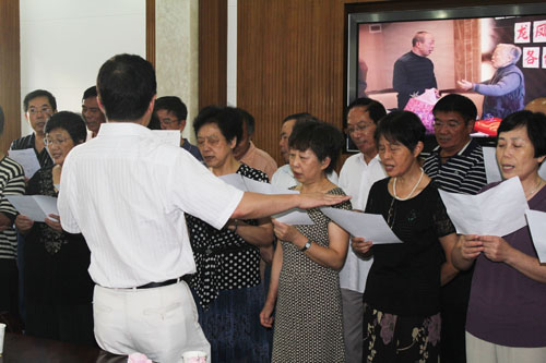 我班同学在排练合唱“老师我想您”(背景是为龙老师祝寿留影)