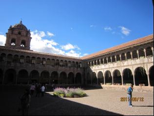 从武器广场向东南步行,来到印加帝国的最大宗教中心——太阳神庙,这座神庙后被西班牙殖民军毁坏,在它的废墟上建起了西班牙多明哥教派的主教堂。印加人崇拜太阳神,自称是太阳神的子孙。太阳神庙由一个大殿和几个小殿组成,这一建筑堪称为印加人建筑智慧的结晶,整个庙宇是由平坦而巨大的石板砌成。据记载,大殿的四周墙壁从上到下全部镶有纯金片,而太阳神庙的“裸露脐石”,下面藏有无数黄金,可以说,太阳神庙是一座黄金堆成的“金窟”。离太阳神庙不远有一座太阳贞女馆遗址,是专门培养太阳贞女的地方。太阳贞女貌美灵巧,深居简出,为神、祭司和印加王举行宗教仪式服务,唱圣歌、跳圣舞。