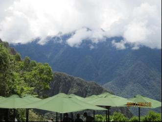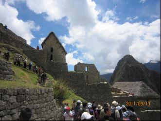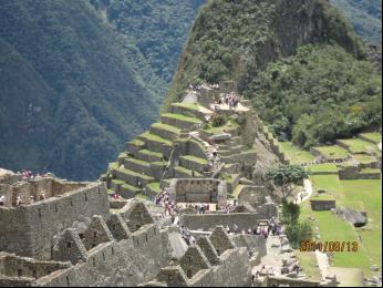 从库斯科城到马丘比丘是坐旅游火车去的,行程需3个多小时,去时49美元,回来60美元。火车一直在崇山峻岭中行驰,其幽深莫测的秀丽景色,令人神往。列车窗外乌鲁班巴河水流湍急,四周悬崖削壁、层峦迭嶂、丛林密蔽。车厢的顶部是用透明玻璃装饰的,游客可以一览云雾缭绕的巍峨山峰,偶而见到河岸上几个放牧的孩童和几匹牛羊牲畜,仿佛来到了脱离人间的世外桃源。从马丘比丘火车站再乘1小时大巴,终于到达古城遗址。
