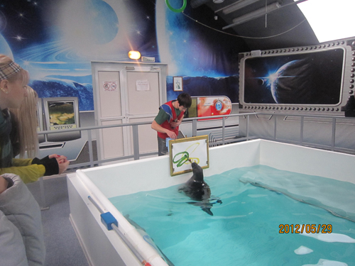 在海豚演艺馆里,漂亮的俄罗斯小伙子为两头海豚设计了一段爱情故事,只见雄海豚在雌海豚面前“频频调情,苦苦求爱”,最后终于获取芳心,双双进入婚姻殿堂。这种戏剧性的表演,惹得观众阵阵欢笑。你看,“携得佳人归”的那头雄海豚又在画板上作画呢,只要你舍得花钱,还可以将那幅画购回家去。