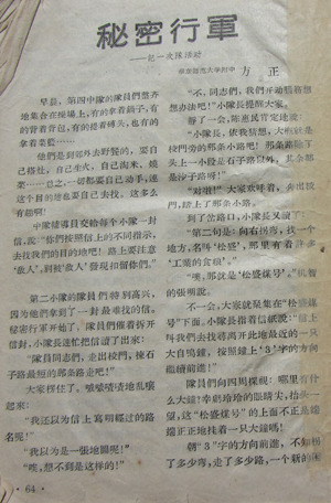 初三时我曾经写过一篇作文,题目就叫《秘密行军》,后来被班主任兼语文老师季振宙老师推荐给了《少年文艺》杂志,结果在《少年文艺》1956年6月号上发表了。美术编辑还在文章里插了两幅图,画得很生动。