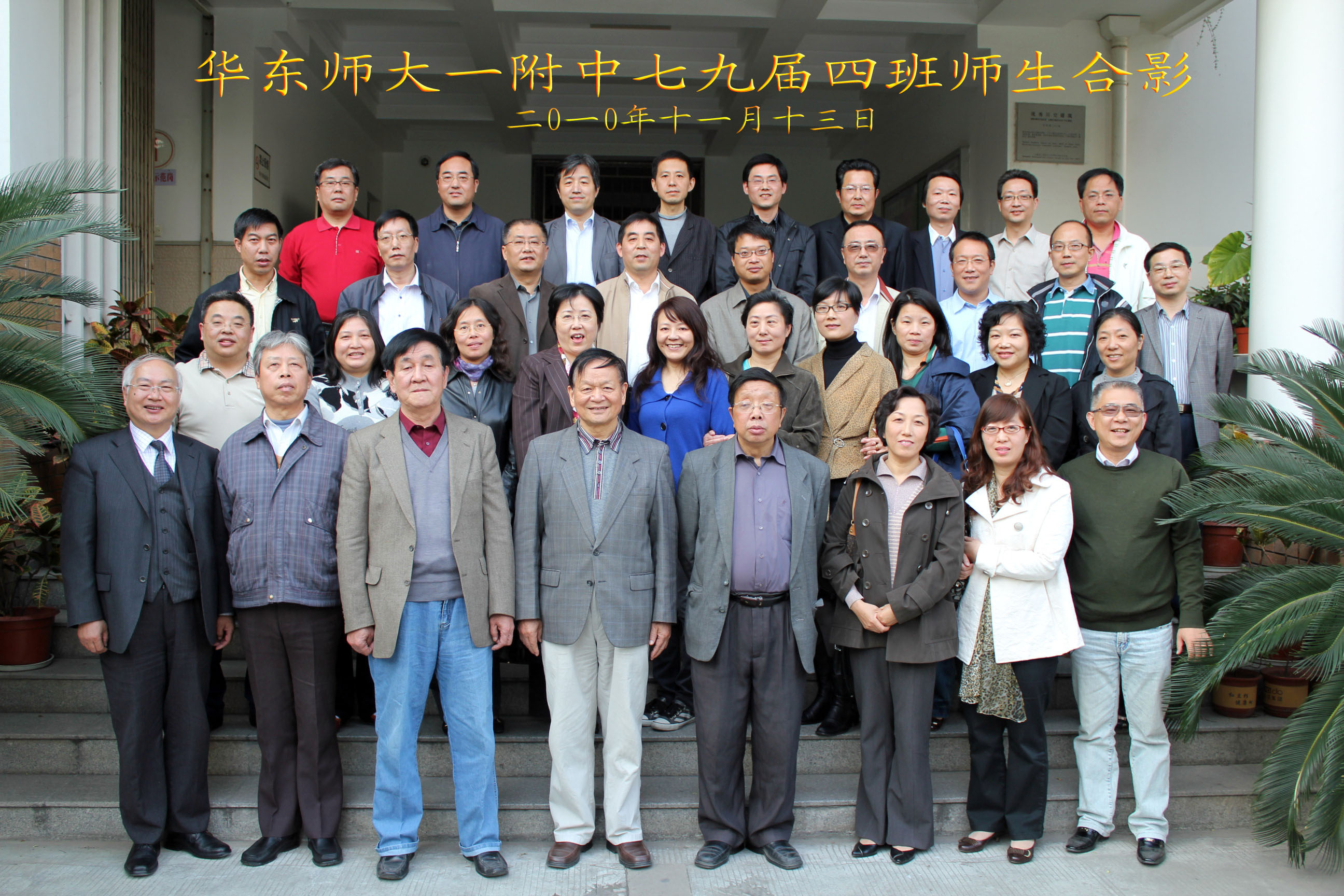 七九届四班与老师(前左一至左五)的合影(2010年11月13日)