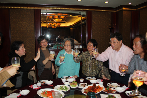 5日的一大清早,刘金铸同学就从浦东驱车赶往长宁区郝普芳老师的住宅,把这位年近八旬的老班主任接到我们的同学中间。张万里、叶则美夫妇甫从美国康涅狄克州归来,即与李均政、何介明等同学一起在校友会的支持下策划这次聚会。郑超同学听说校友聚会,便特意从杭州赶来参加,黄慰栋同学因故不能从成都前来赴会,便打来电话,与同学们一一倾诉衷肠。