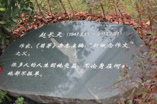 赵长天的铜像坐落在绿树翠竹之侧,他俯视大地,凝眉沉思,仿佛仍然在构思文学事业的发展框架。大理石墓碑上镌刻着“赵长天(1947.3.11——2013.3.31) 作家,《萌芽》杂志主编,‘新概念作文’之父。很多人的人生因他受益,不论身在何处,他都不孤单。”