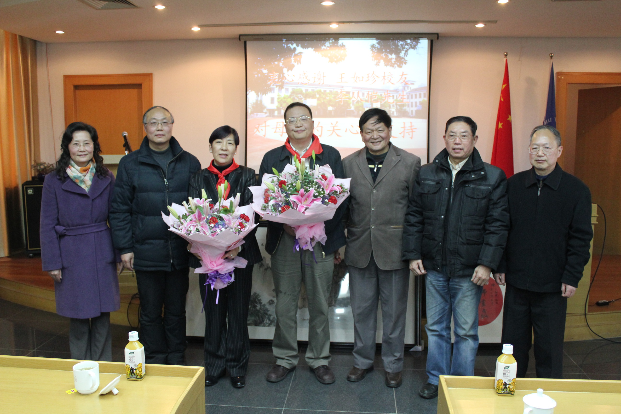 王如珍校友(左三)、李从恺先生(左四)与母校及校友会领导合影(本站摄影)