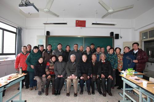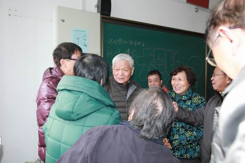 下午四点,母校和校友会领导陈步君、丁伟强、吴传发和项志良从老校区赶来,当他们走进教室看望在座校友时,更是把活动推向了高潮。学校和校友会领导向大家拜年,祝校友们身体健康,并希望大家常回来看看。我们和领导们在一起合影留念,闪光灯的频频亮起,给大家留下了一个美好的记忆。