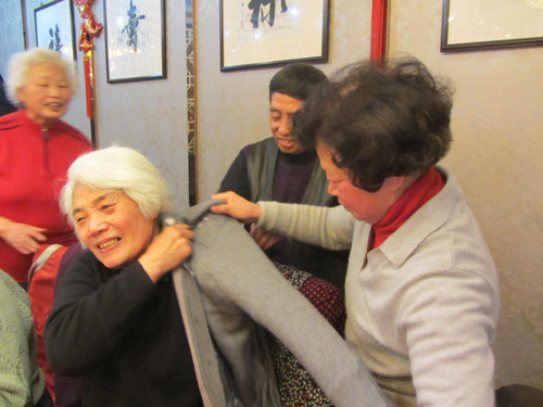(右起)徐意诚和诸雨民为林老师穿上大家赠给林老师的毛衣