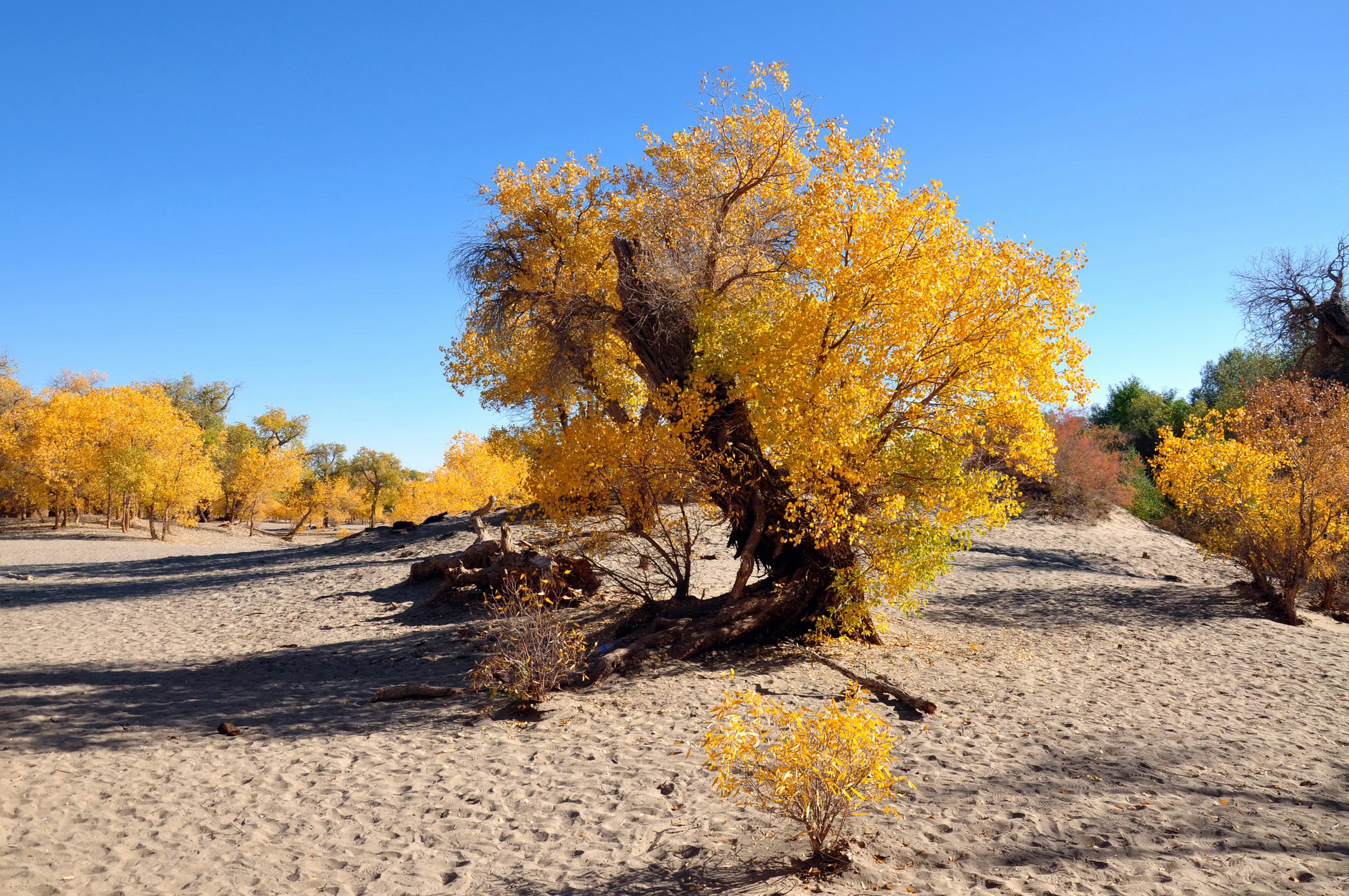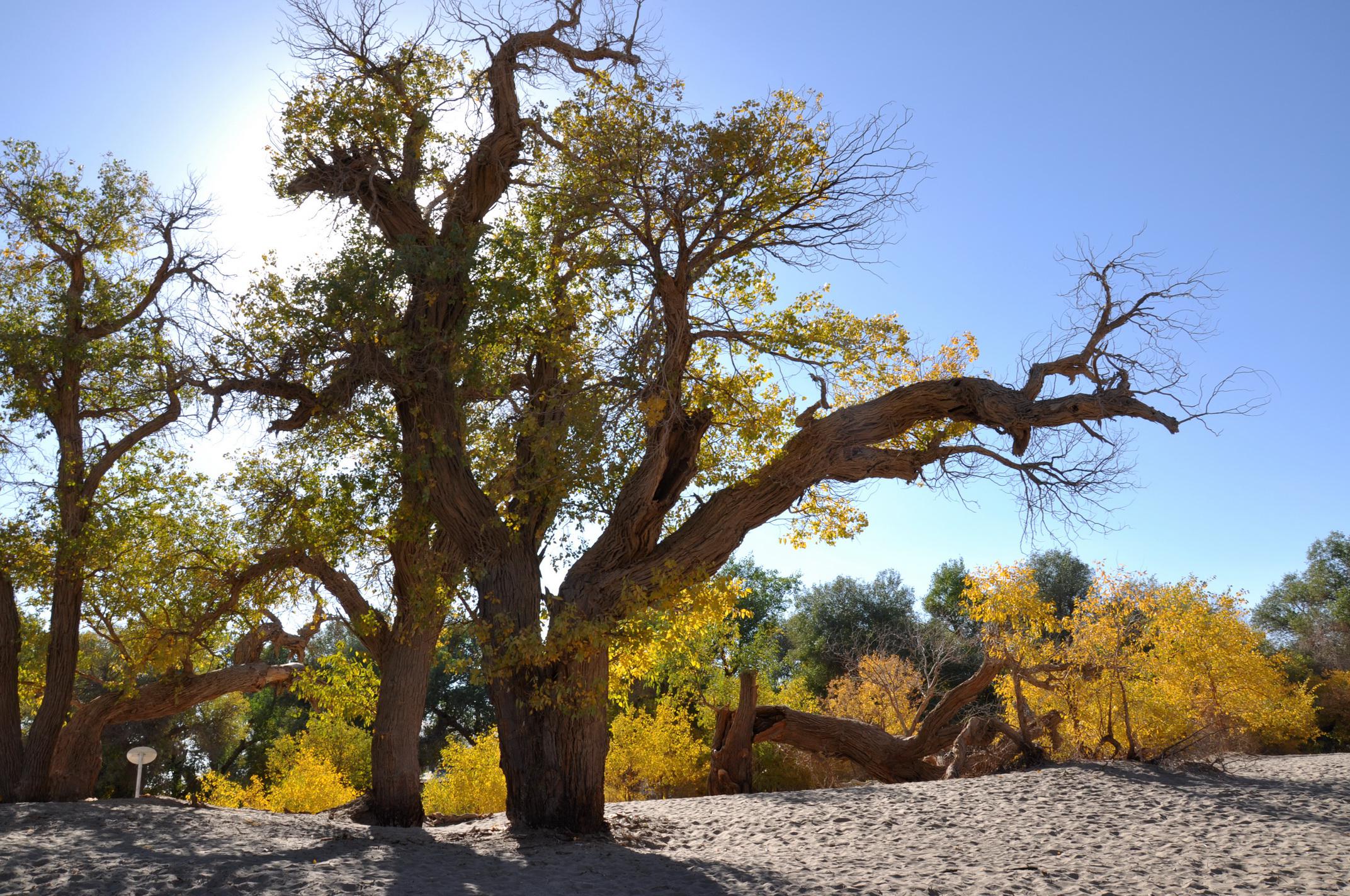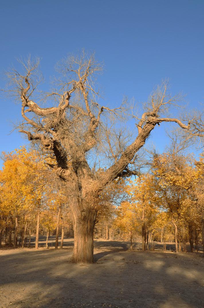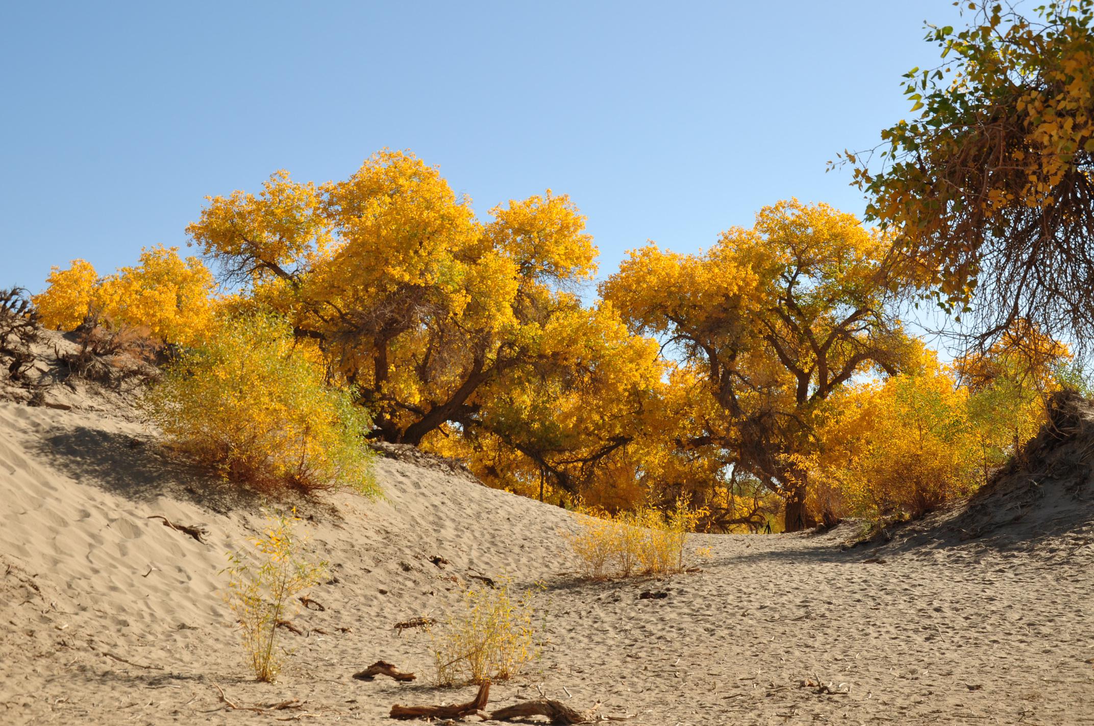 然而,只有当你看到沙丘上的胡杨林,才认识到沙漠没有往前推进,是这些胡杨林扎根百米深,把沙丘死死挡住,他们是英雄树,英雄林啊!(图8、图9、图10)