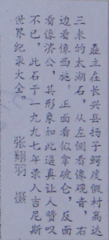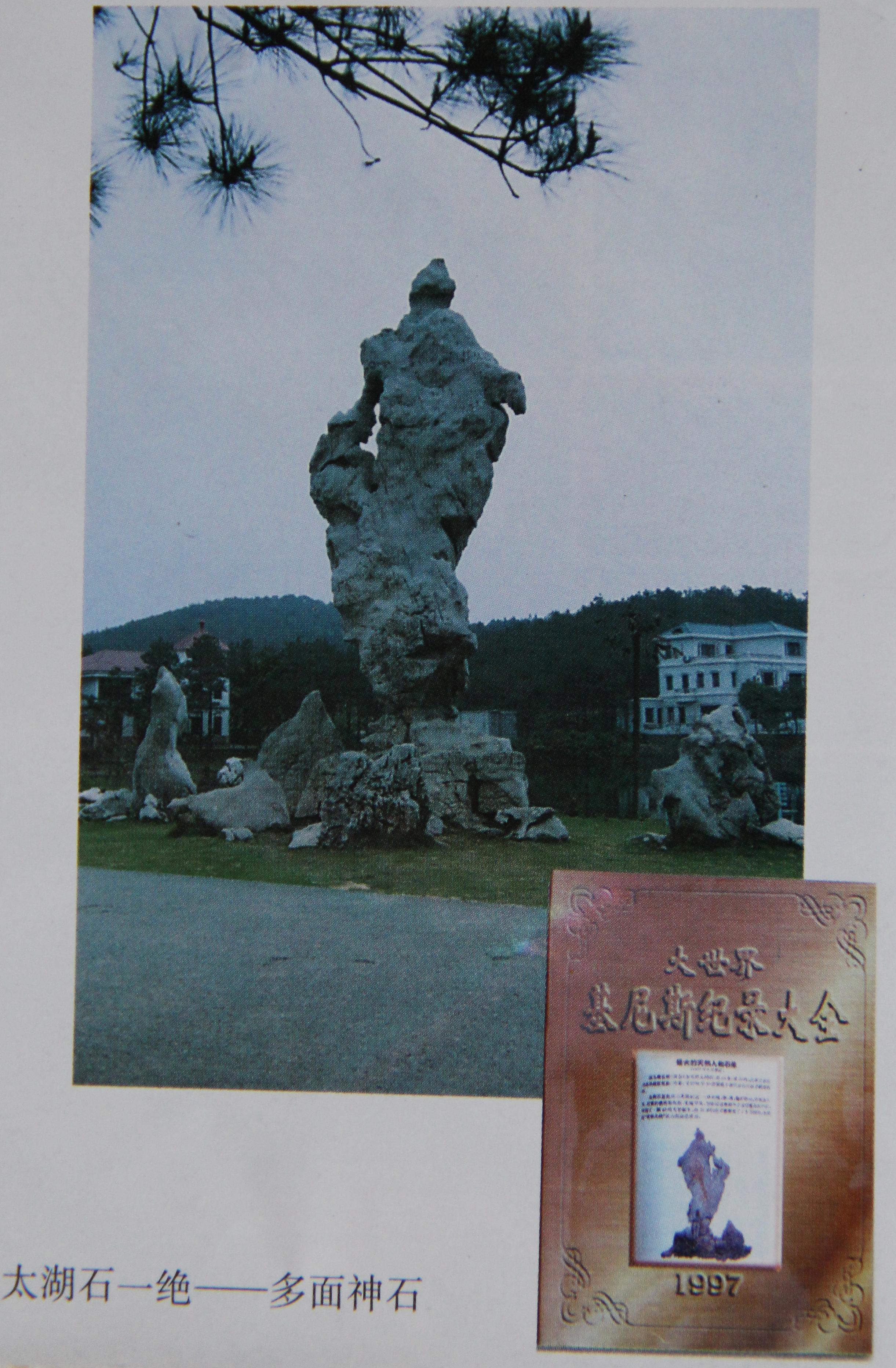 矗立在长兴县扬子鳄度假村高达三米的太湖石,从左侧看像观音,右边看像西施,正面看似拿破仑,反面看像济公,其形象如此逼真让人赞叹不己,此石于1997年录入吉尼斯世界纪录大全。