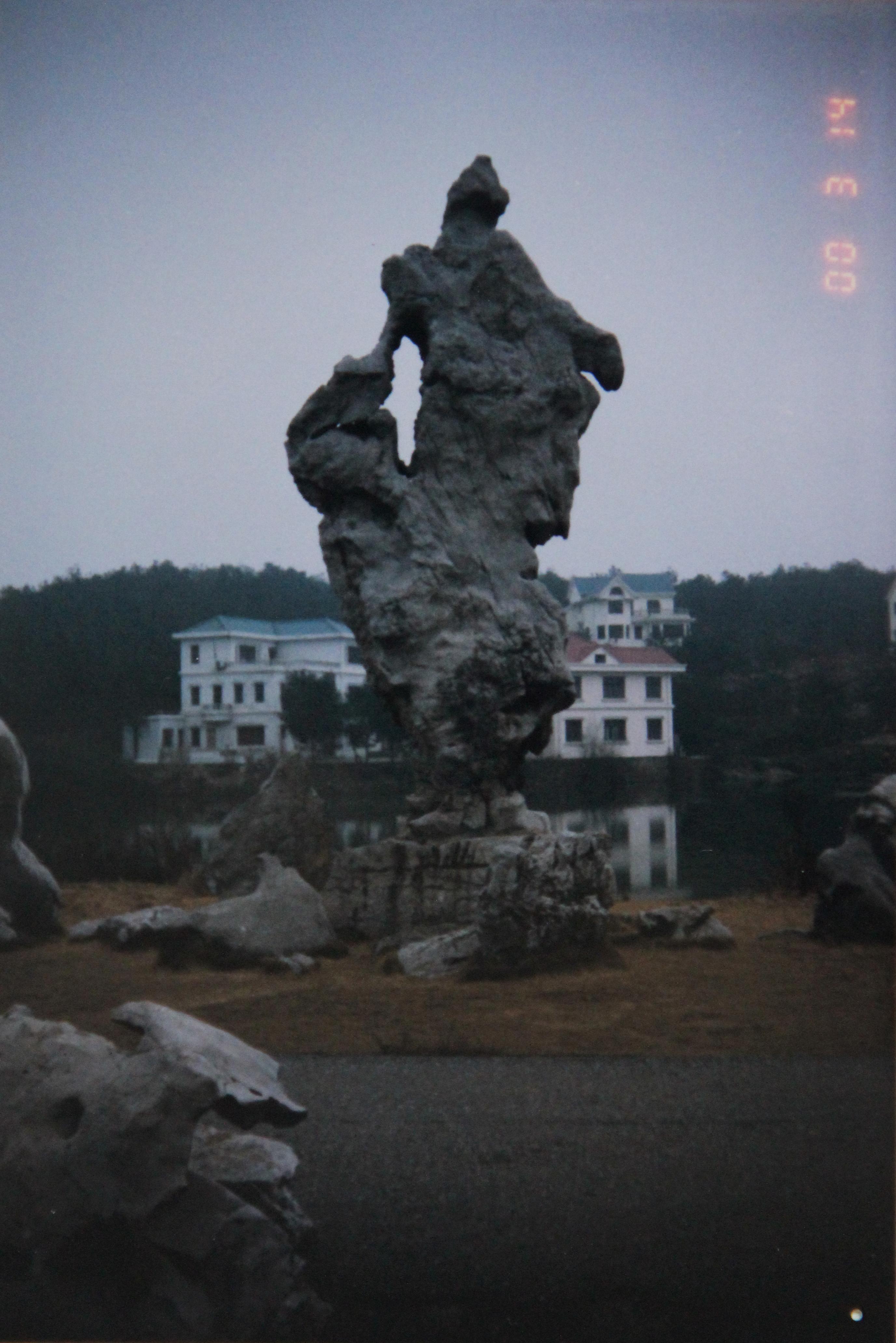 走出那个小门,想起昨晚来的时候,真是有惊无险,我得感谢那位电动三轮车车夫给我留下了一个很有激情的回忆。走到路口,等了好久,终于截住了一辆出租车,请司机为我在“扬子鳄度假村”石峰旁留了个影。路边这么高大的一块峰石,来的时候,居然没有看到,足见昨晚的天色实在太黑了。