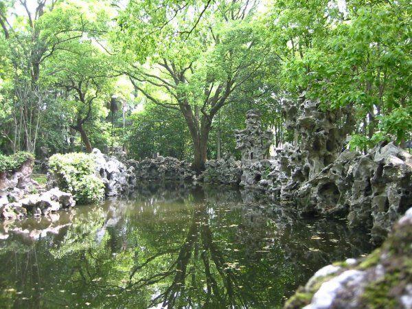 用太湖石布景的水塘 “钦若嘉业”的九龙金匾