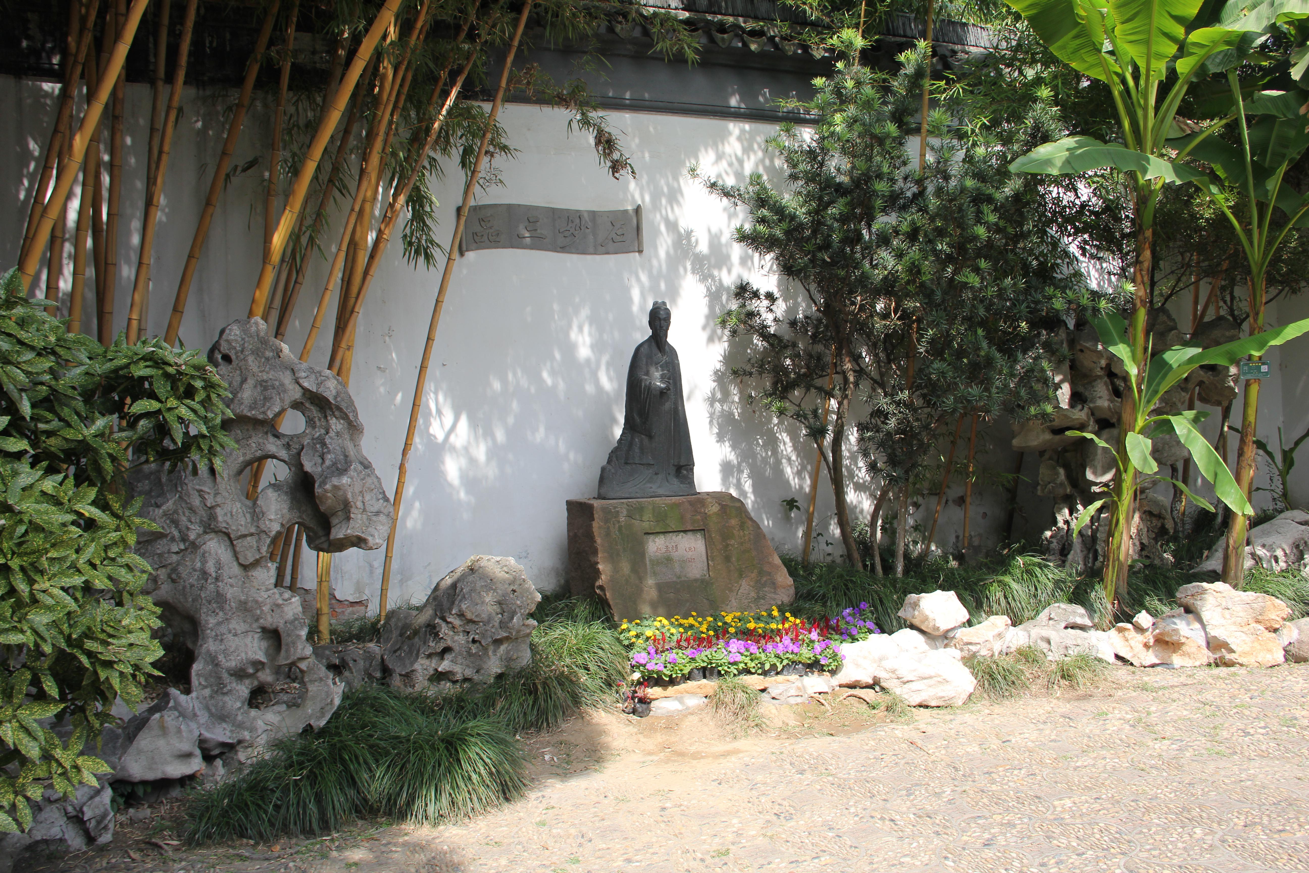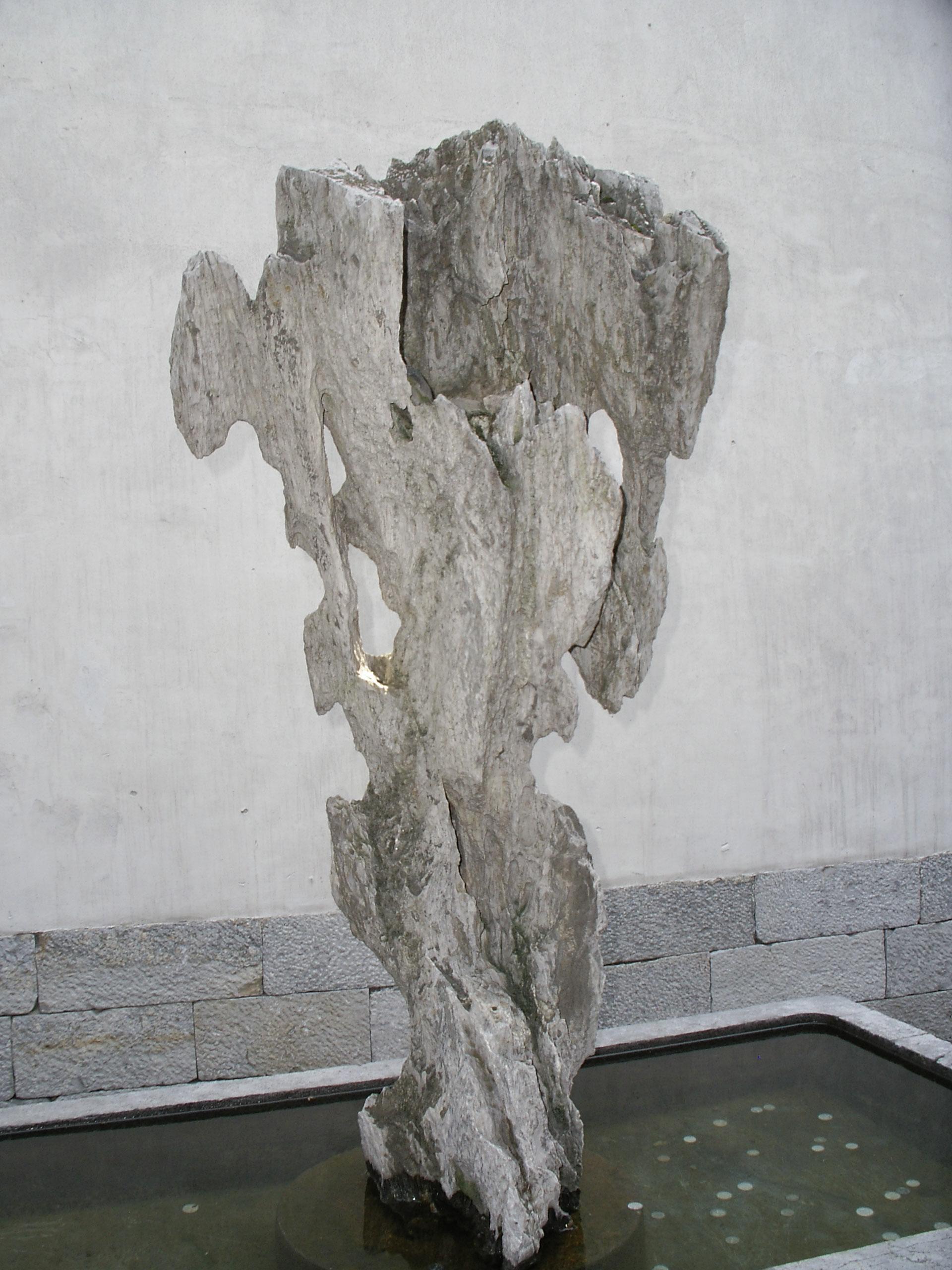 赵孟頫的铜雕像两侧各有一方玲珑剔透的太湖石(2013年)