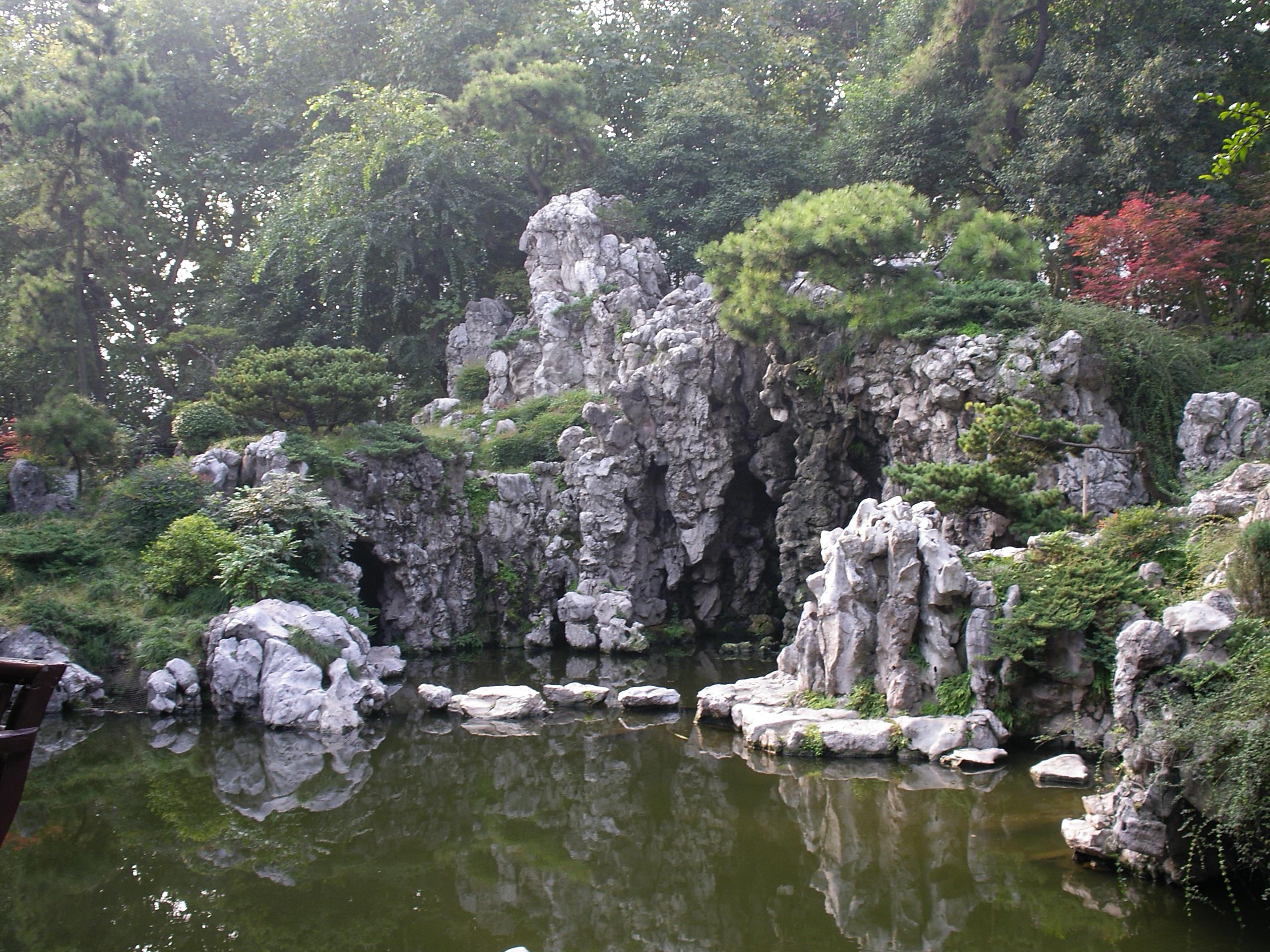 北假山的临水石坪是明代遗迹,分上下两层,高低错落,其景面构造、叠石技巧,堪称江南一绝。