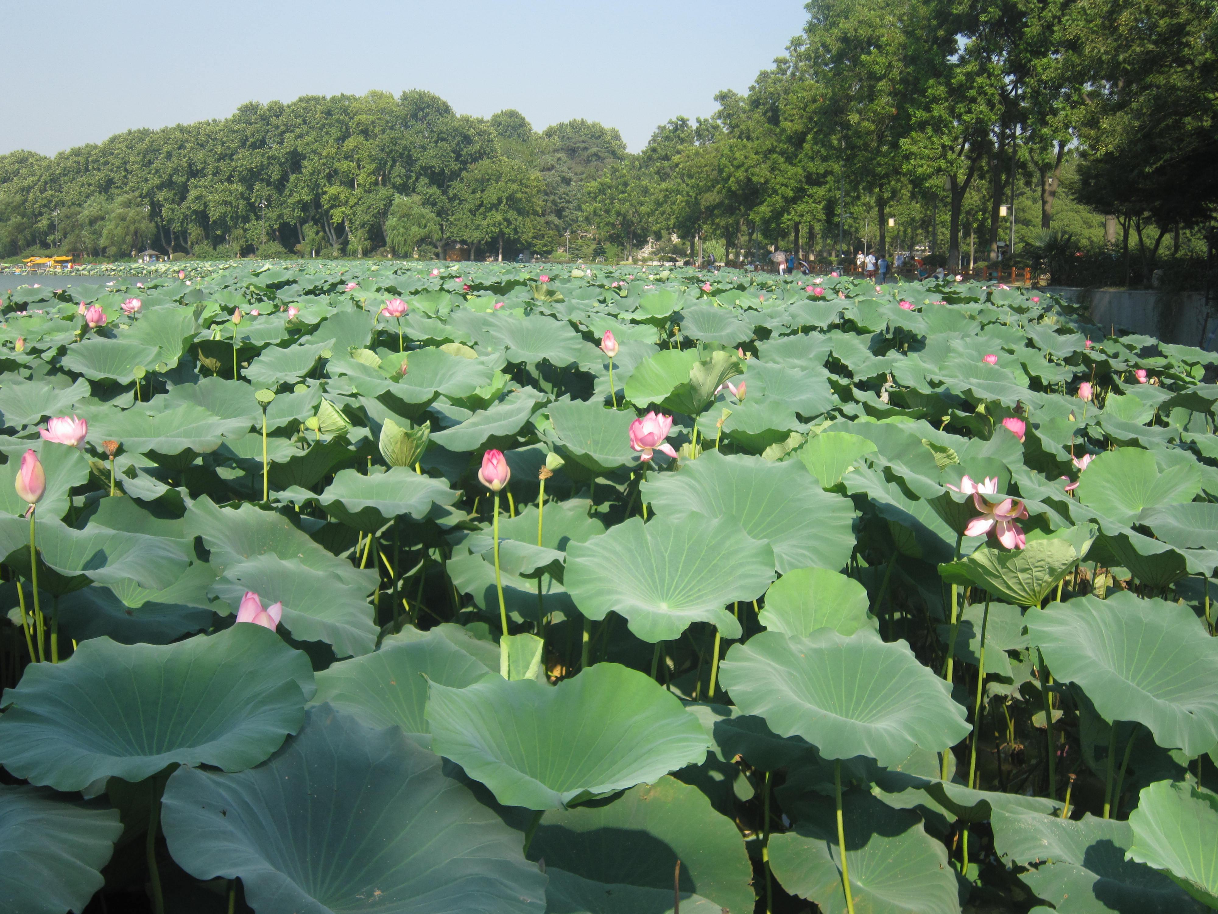 穿过玄武门,便见一片宽阔的水面,三伏天气,荷花盛开,杨万里咏西湖荷花的诗句在玄武湖也得到了佐证:“接天莲叶无穷碧,映日荷花别样红”。说真的,尽管多次来南京,我还是第一次进玄武湖公园。因为西湖、太湖看得多了,总觉得玄武湖不会有什么特色。玄武湖很大,据说是全国最大的城市内湖。我没有的足够的时间去环湖游览,只是想去看一看“童子拜观音石”和“米芾拜石”。
