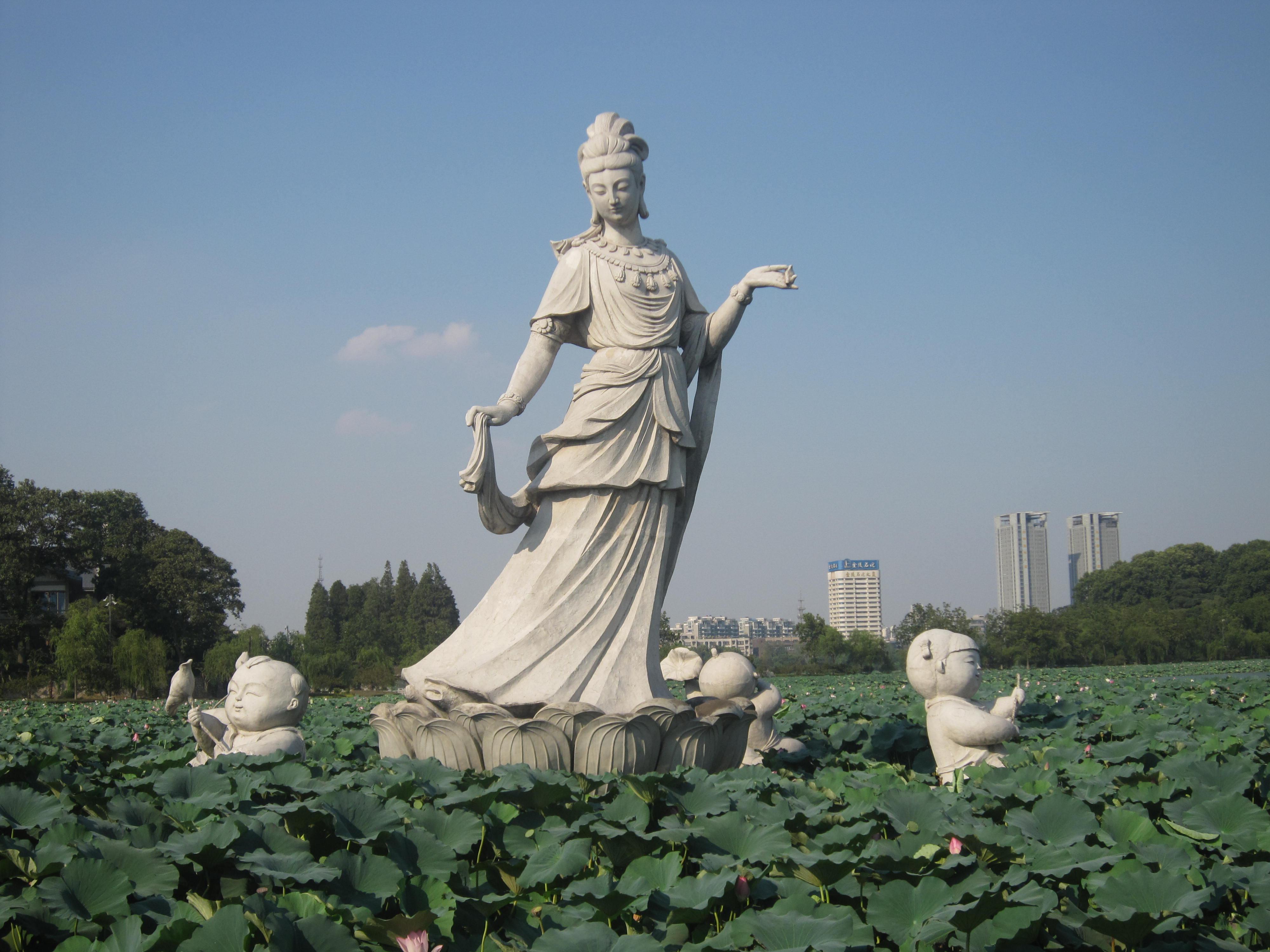 “米芾拜石”对面芳桥侧畔的湖面上,立着一座高大的莲花观音(又名莲花仙子)雕像,显得很壮观。“雕像”与“石丈”隔水相望,引起了我的遐想,米芾应该是拜石还是转过身来拜佛呢?