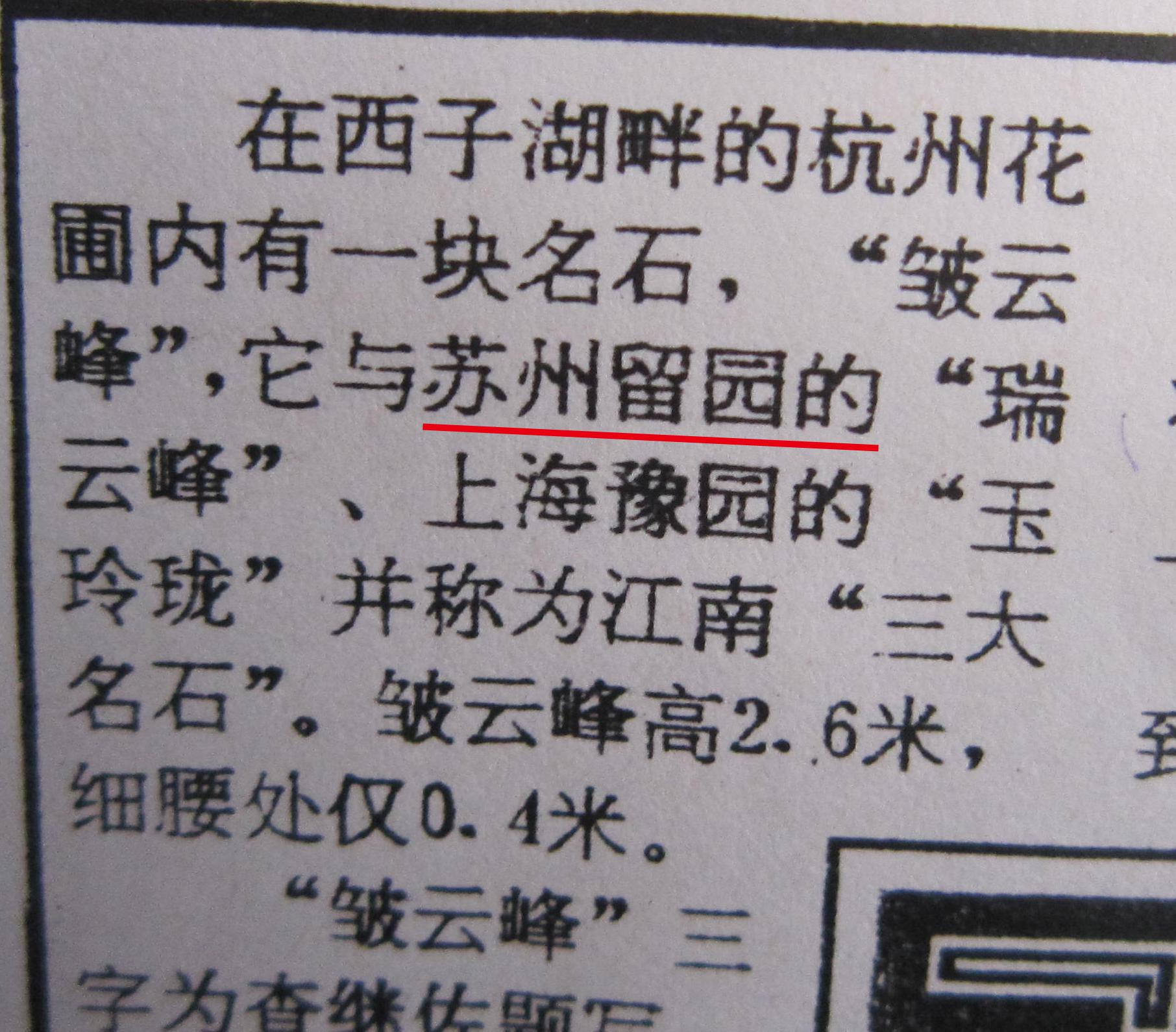 上世纪90年代刊登“江南三大名石”瑞云峰错误地址的剪报