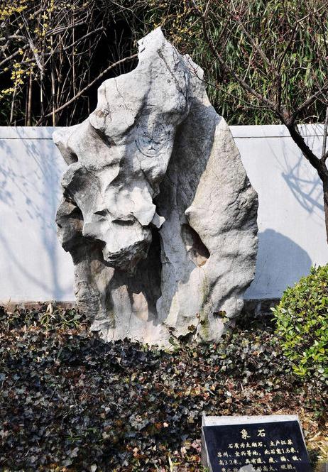“象石”也是太湖石,具有透、瘦、漏、皱、秀等特点;从一个侧面看,形态就像一头向你缓缓走来的大象,高大硬朗;宽约1.3米、高2.7米,石峰上侧刻有一枚章印,很有特色。