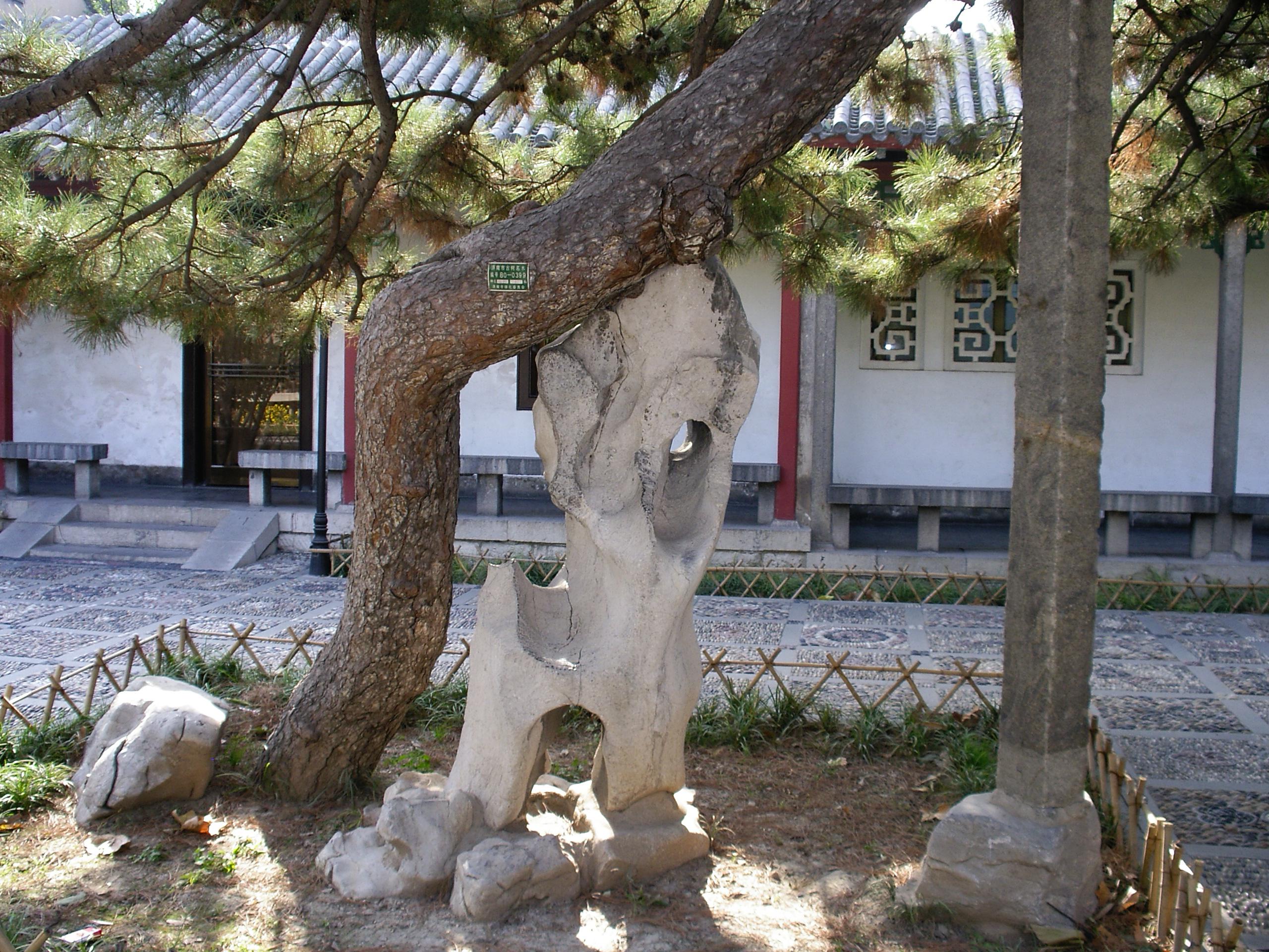 待月峰 位于尚志堂院内、尚志泉畔。太湖石种,宋代遗物,石瘦细长,有多个洞穴,似各种月形,从不同的角度观赏,有各种不同的形状。夜深月明,月光透过洞穴洒在地上,形异多变,有诗赞咏:“精灵俊逸玉玲珑,神工鬼斧浑然成。一年三十六轮月,变幻俱在此石中”。