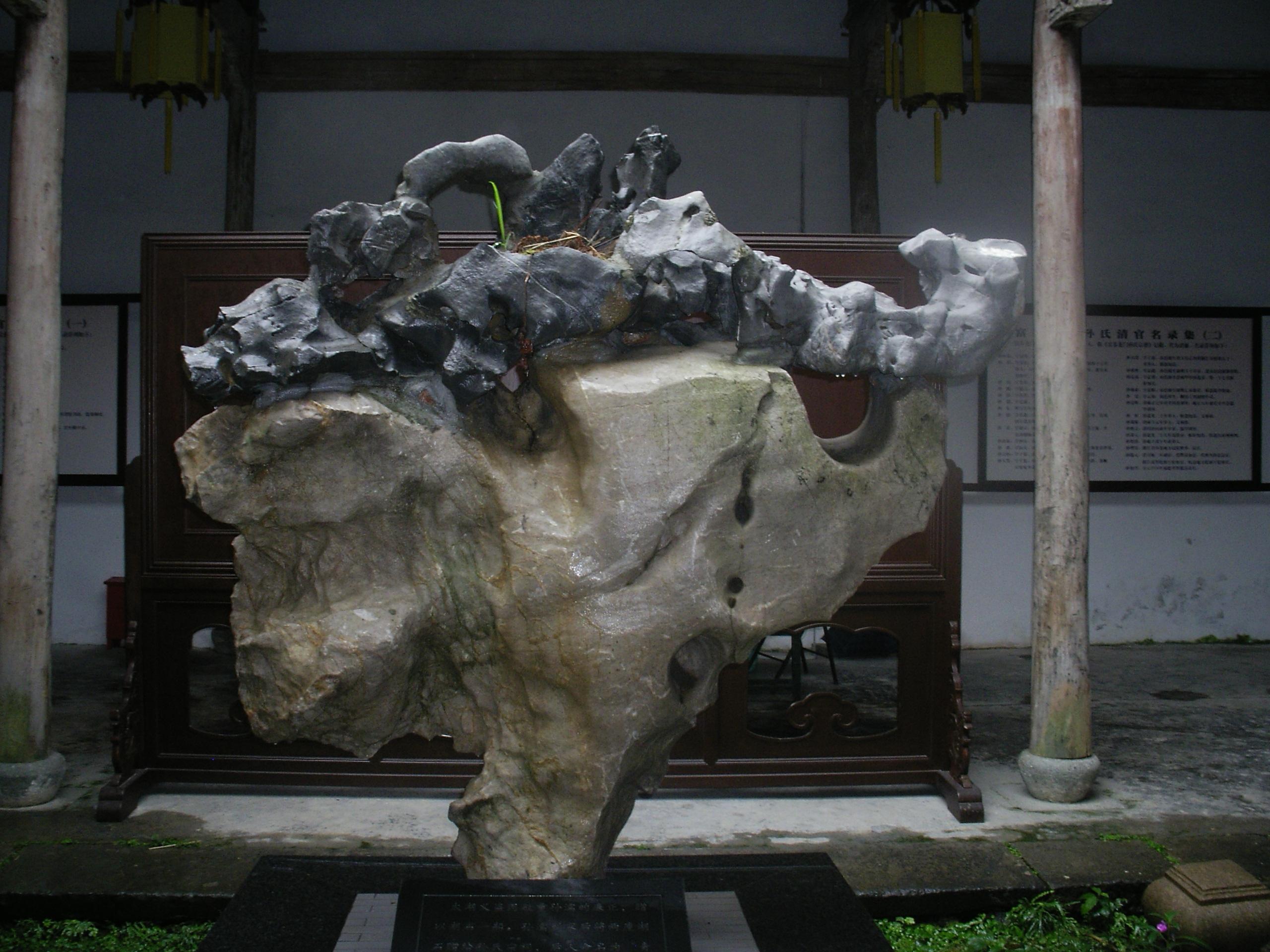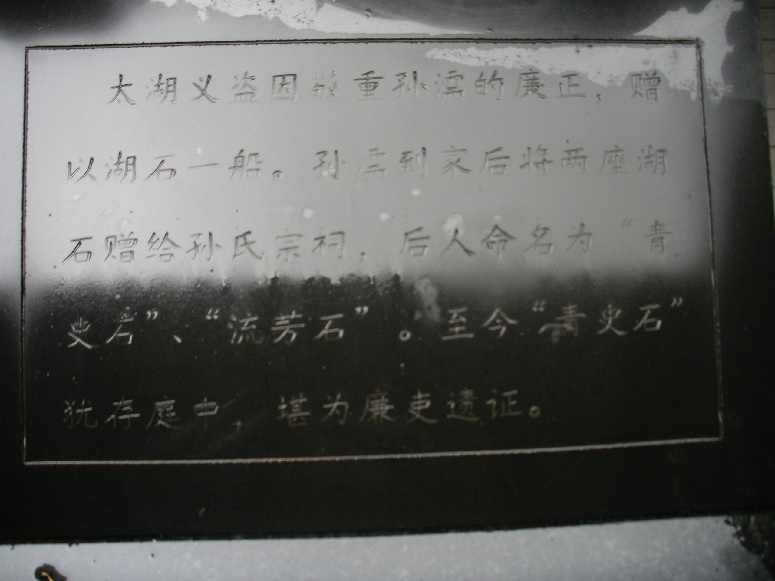 在孙氏宗祠前院有一座太湖石,上呈黑色,下呈白色。黑白分明,造型奇特。下面有一标牌说明: