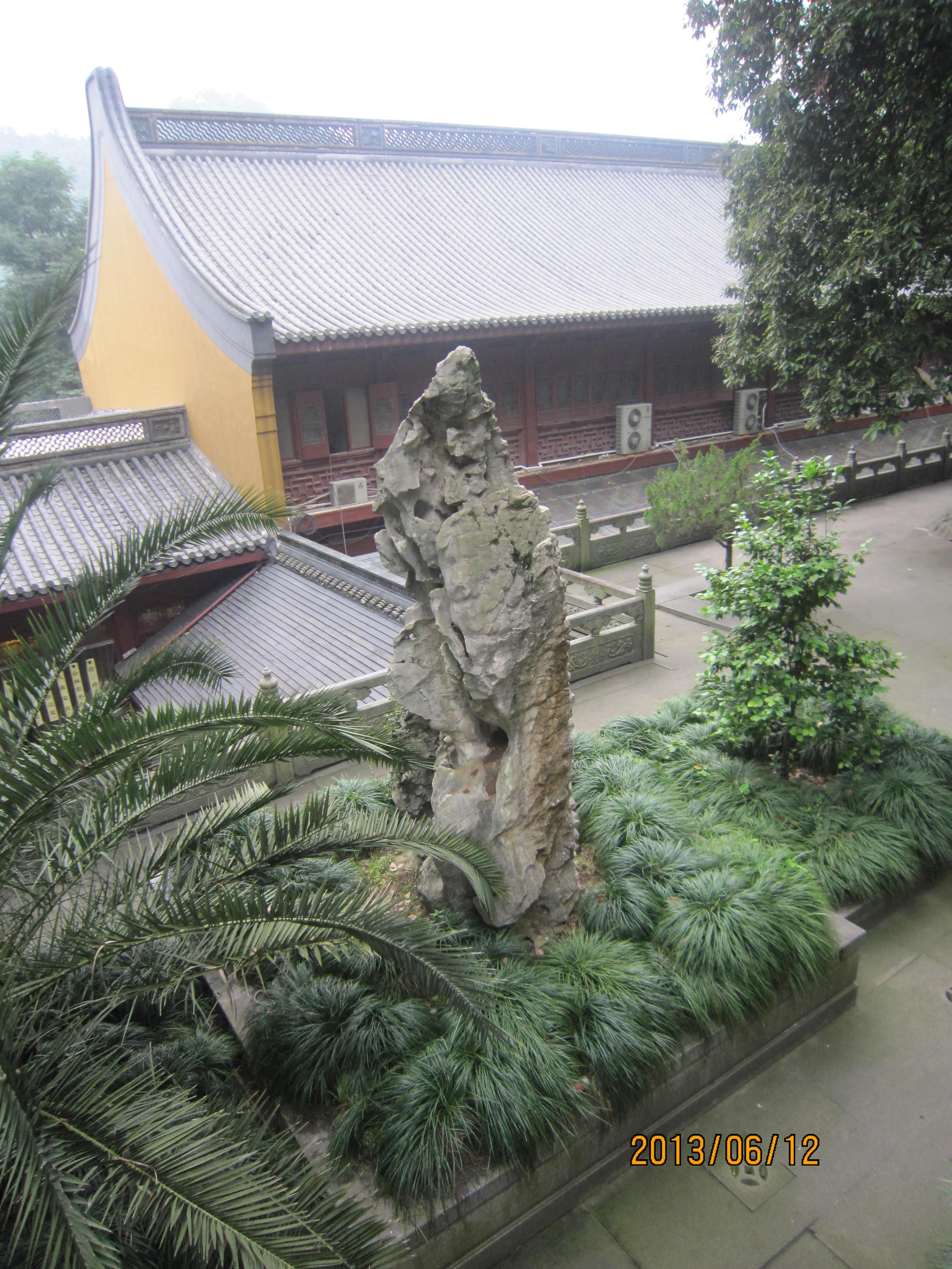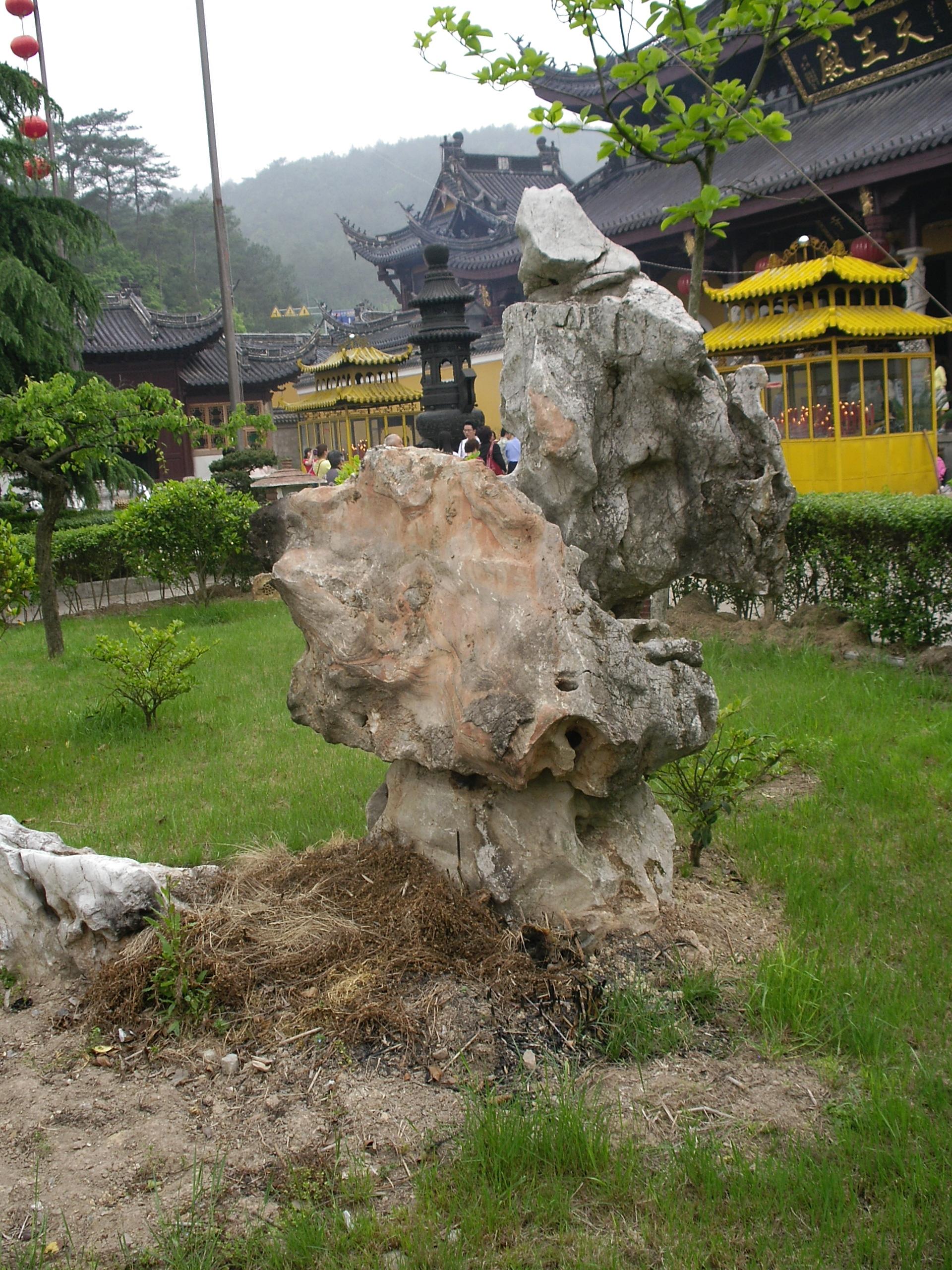一走进雪窦寺,就见到一座太湖石峰,其形态虽然丑陋,却“盘踞”着一片“圣地”。可见:奇石不仅可在园林点缀景点,也可在名刹古庙“参禅拜佛”。且称它们为“禅石”吧。
