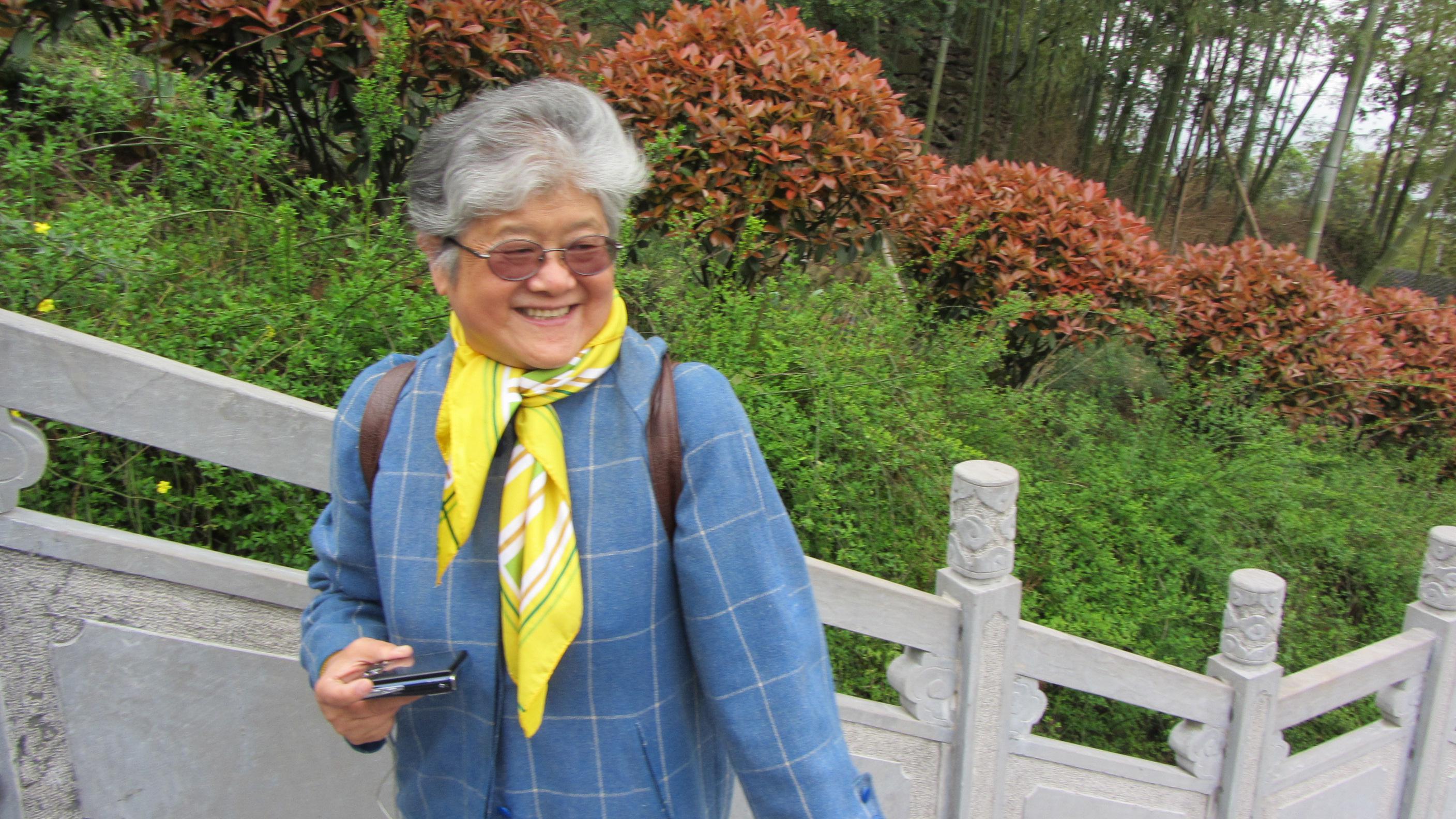 王湄君在德清参观初中老同学周晓光设计的高峰禅寺(2012年4月23日 方 正摄)