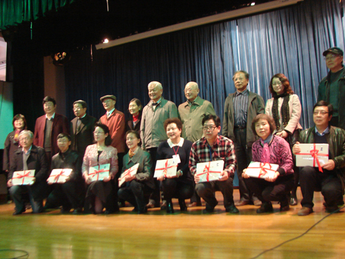 陈步君(后排右五)向74届校友颁发学业证明后和大家合影