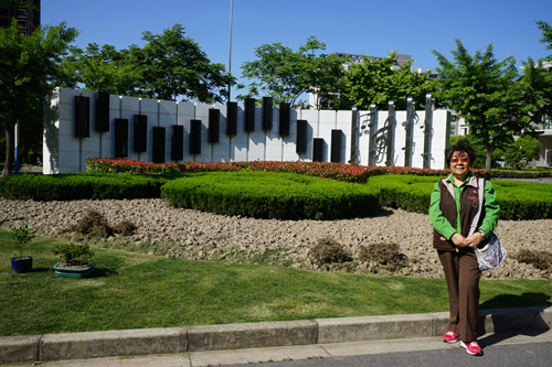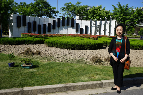 今年5月21曰,我們55屆高三乙班老同學舉行“畢業六十周年返母校”活動,12月6日55屆高三甲、乙、丙三班老同學一齊參加了紀念華東師大附中建校九十周年的“九十載 附中情”慶典,兩次來到虹關路新校園。一進大門在國旗下就看到花叢中以錯落有致竪狀長方體組成的充滿生機的琴鍵造型,跳動出歡快音符,印襯了六十多年前附中大合唱的那段輝煌。我們這批當年的老合唱隊員,不禁紛紛駐足,拿出相機,拍照留念。我先替當年的“鋼琴女孩”葉慕蓮和金嗓美女之一徐承谷按下了快門:接着,其余同學三三二二地在這富寓詩意的校景前,先後紀錄下了美好的瞬間。