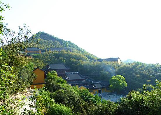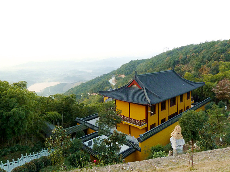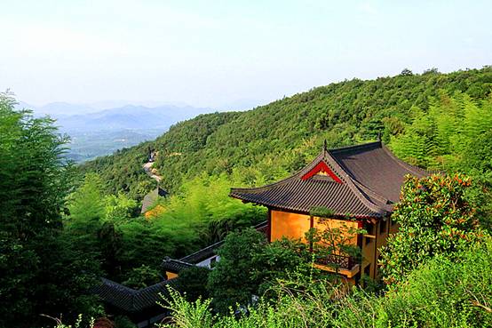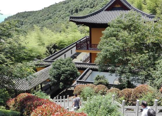 高铁列车快速、平稳、舒适,可以自由走动,茶水、厕所,随时可用。比起坐长途客运要舒心多了。9:05列车准时到达德清。一出站就有两位高峰禅寺的师父曾怀旭和释正心把我们分别接上两部小车。穿过宽阔的德清大道,就进入了清净的山路,左拐右拐不断上坡,终于来到了群山环抱的高峰,一座禅寺隐隐约约在漫山遍野郁郁葱葱的竹林和绿树之中,真是风景如画啊!