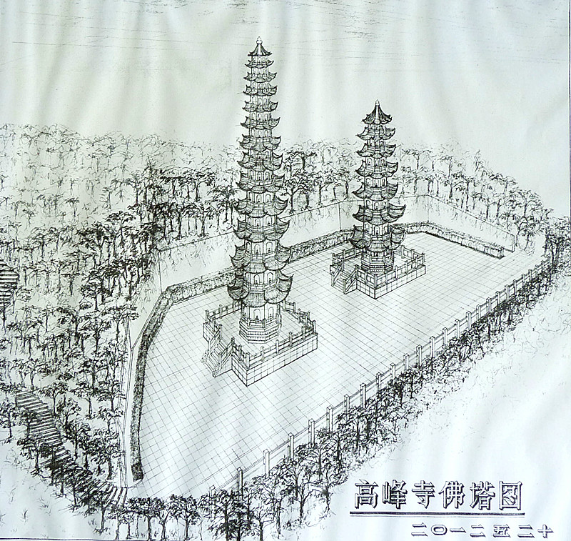 在周晓光写的《浙江德清高峰禅寺 建筑设计理念与人文景观》一文中,有两张他的设计画稿,一张是山门、大小月台效果图,一张是佛塔效果图。眼前都一一变成了现实。