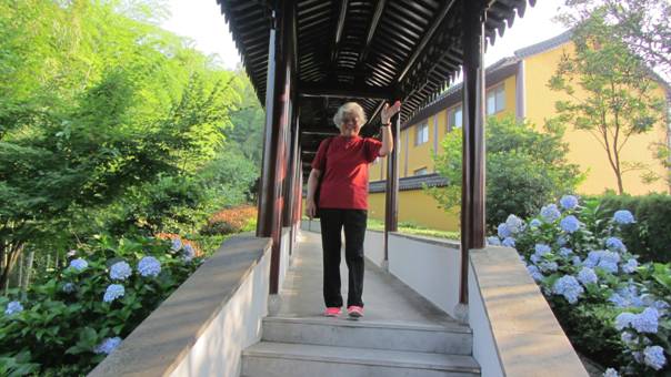王湄君在长廊里招手致意
