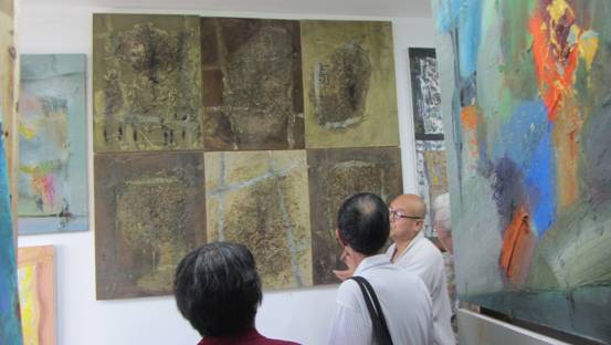 下午,寺院的住持大憨师傅请我们喝茶。他1993年毕业于华东师大艺术系油画专业,后在上海大学美术学院建筑系任教,2002年3月在浙江雁荡山之南寿昌古刹剃度出家,拜谒佛门大德元音宗师,后来高峰禅寺担任住持。他还是湖州地区佛教协会的副主任兼秘书长。他一边参悟人生,参悟佛学,一边作画,成为一名在“色•空”中穿越的僧人与现代画家。他的画,融会中西,具象与抽象结合,富有哲理。尤其是“井”字系列的油画作品,寓意深邃,耐人回味。我们一边参观,一边听他介绍。