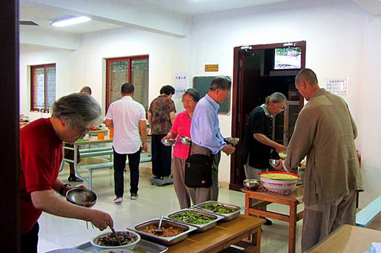 吃饭是在斋堂里,寺院提供新鲜的水果和自种的蔬菜,以及花色品种多样的素食点心和可口的饭菜。