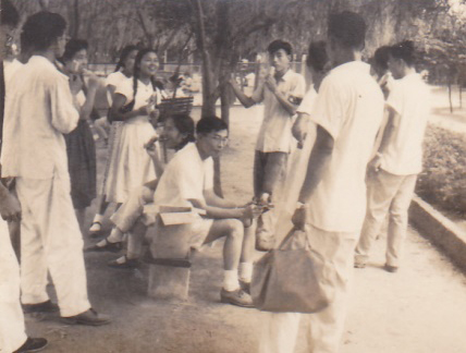 對於這張舊照, 我只能推測這是他們中學時在虹口公園的一次聚会活動, 大家正在吃冰棍, 坐在櫈子上的男同學是傅敏, 他斜後方的女同學是知惠和王曼曾, 知惠正在說什麼, 似乎很高興的樣子! 【经王维康辨认,照片上自左至右为:金永华、王曼曾、曹锦芳、王知惠、郭泽正、傅敏、陈孝模……】
