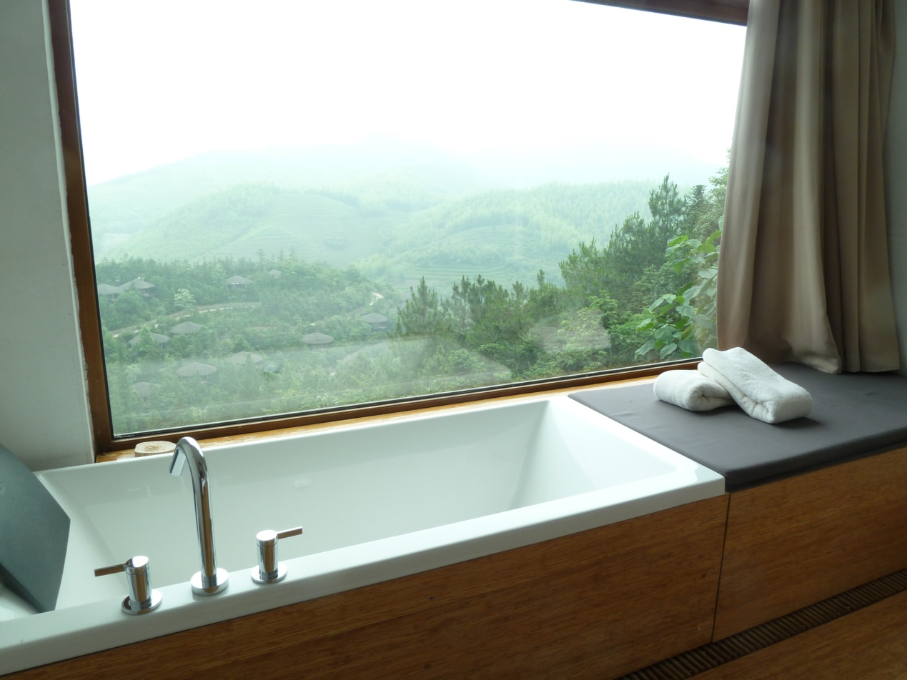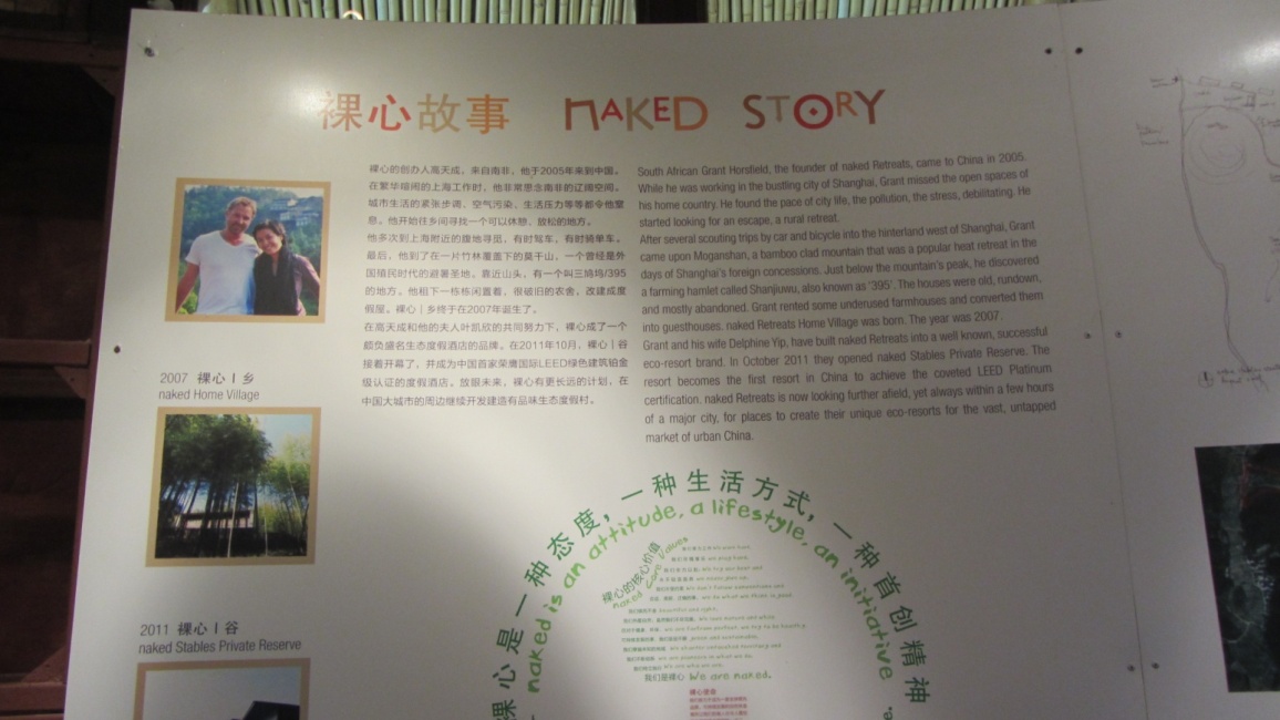 看介绍,裸心谷的创办者Grant Horsfield是个南非人,他有个中国名字叫“高天成”。他于2005年来到中国,在繁华喧闹的上海工作时,他非常思念南非的悠闲生活。他多次驾车和骑自行车到上海周边寻找一个可以休憩放松的地方。结果找到了竹林覆盖下的莫干山。被这个曾经在解放前让外国人来避暑的圣地吸引住了。随即他在半山腰租下了一幢幢闲置的破旧的农舍,分批改建成度假屋。直至2011年10月裸心谷终于揭幕,并成了中国首家荣膺国际LEED绿色建筑铂金级认证的度假酒店。