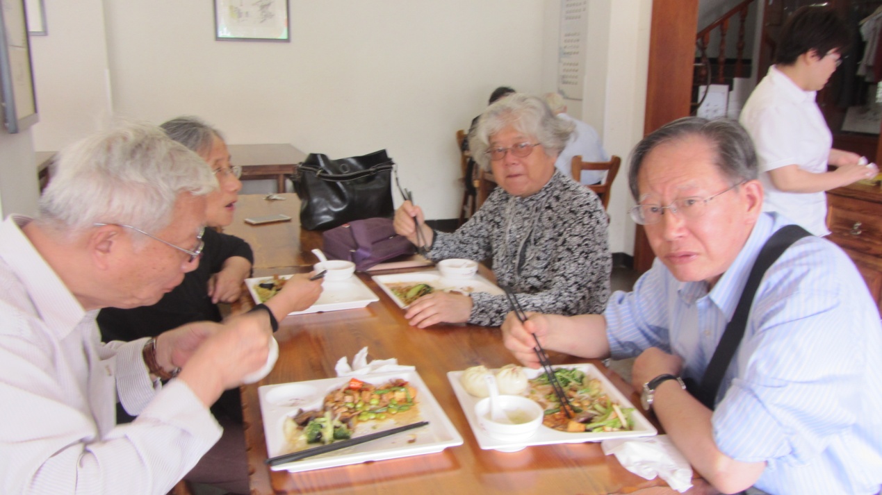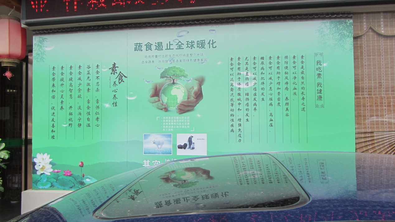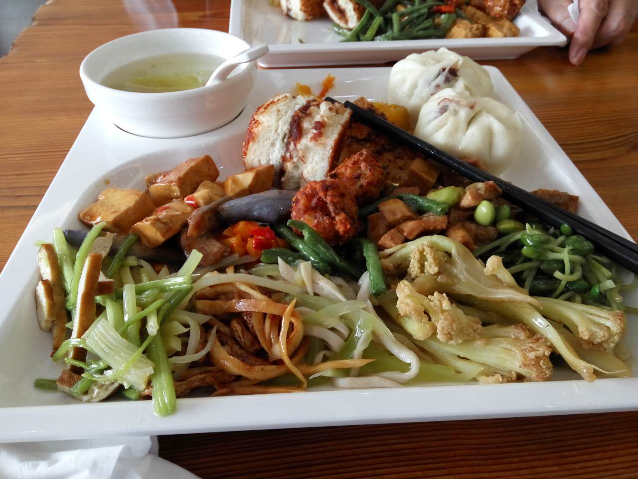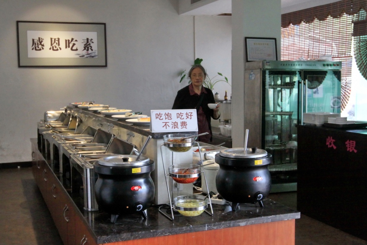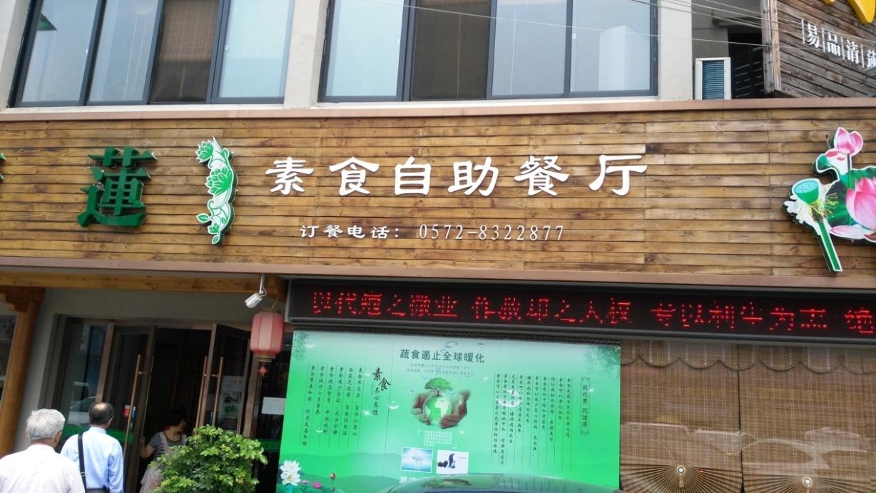 中午,我们在武康镇上一家素食自助餐厅用餐。尽管全是素食,却是很有特色。花色品种,丰富多样,美味可口,还大力提倡素食有益养身养性健康的理念。